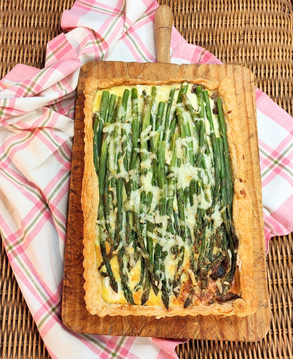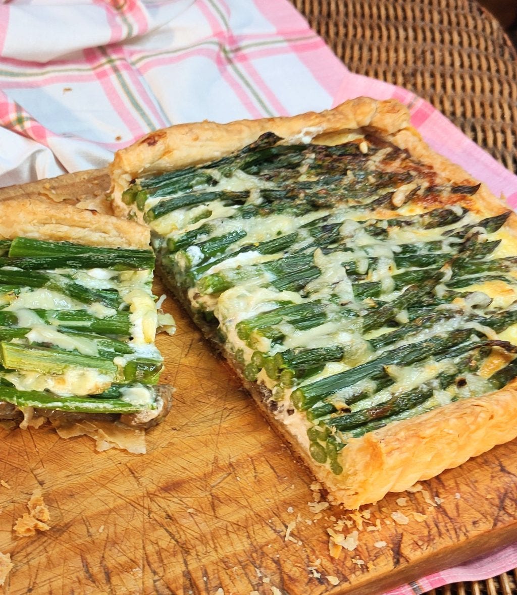 I prefer the tart made on the day I’m going to eat it, but I sometimes bake the shell the day before. If I want to serve it warm, I prepare all of the ingredients – steam the asparagus, sauté the shallot and mushrooms, and so on, then assemble it and bake it just as we sit down for the starter.