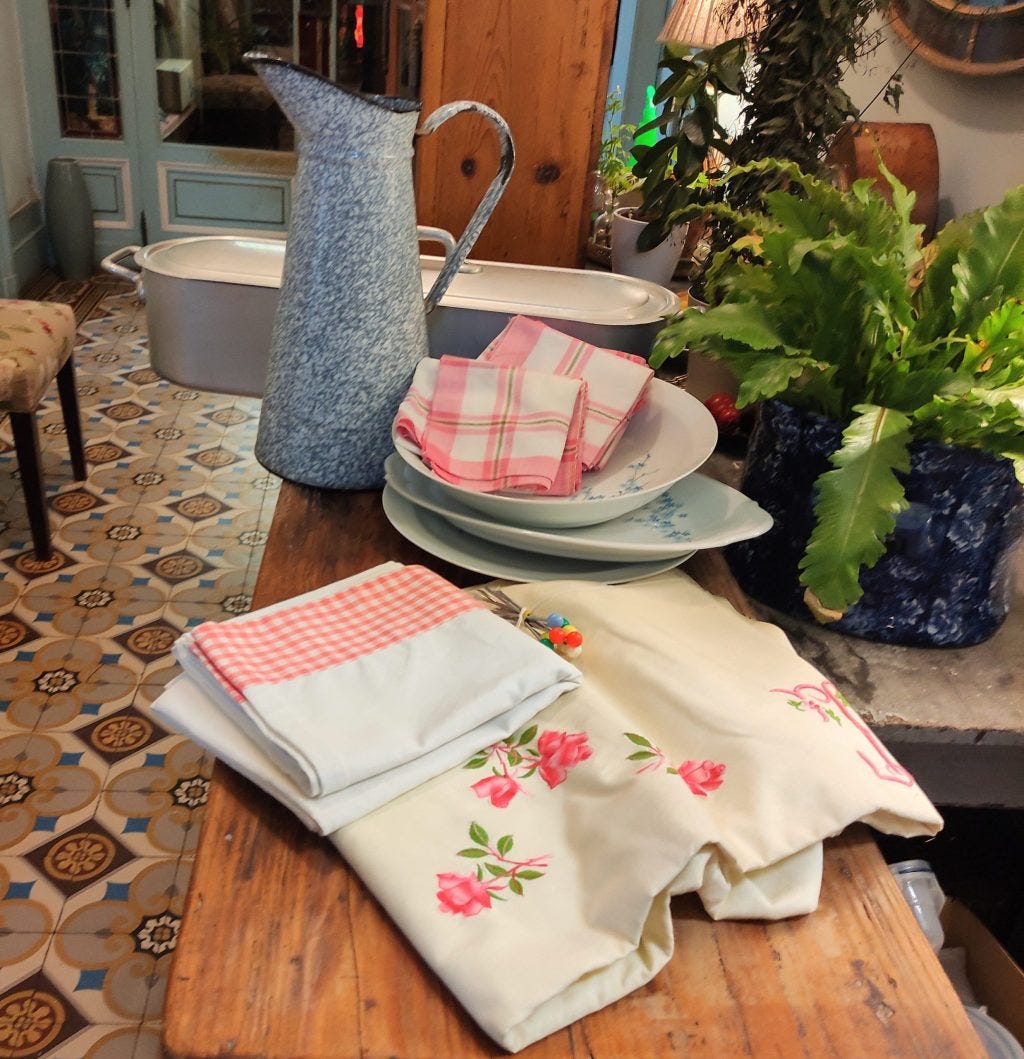 My brocante haul comprises cocktail picks, a linen sheet embroidered with roses, a white linen bolster cover edged in pink gingham, two white platters and a bowl decorated with painted forget-me-nots, eight pink checked tea towels I’m going to use as napkins, an enamel pitcher and a large fish kettle I’m going to plant up with herbs. I took this picture in the hallway, on top of the bottom half of a dresser I bought off Facebook Marketplace, which was just delivered, because the dining table where I normally take pictures is full of the contents of the pantry while the carpenter is busy constructing proper larder cupboards. Welcome to my life. It’s partially organised chaos.