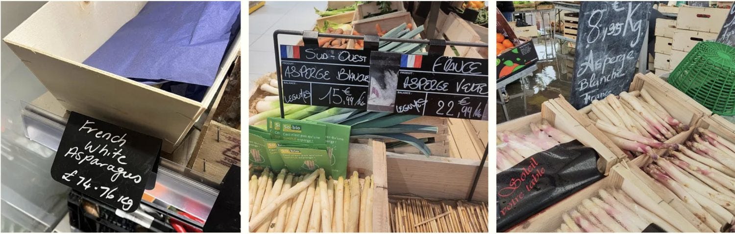 Last week, my friend Cat shared a picture on our WhatsApp group of an empty wooden crate in a London greengrocer’s where once lay some white French asparagus. It was sold out. Even at £74.76 a kilo, it was sold out. I know white asparagus has its devotees, particularly among the Germans and Spanish, but I prefer the green myself. Nonetheless, in the interests of this report, when I was at the organic shop in Agde to buy the asparagus for today’s tart, and at Mèze market on Sunday, I checked the price of white French asparagus in France, and, well. In the organic shop, it was plentiful and 15.99€ a kilo, while the green was 22.99€ and sold out, and in Mèze, it was a bargainous 8.95€.