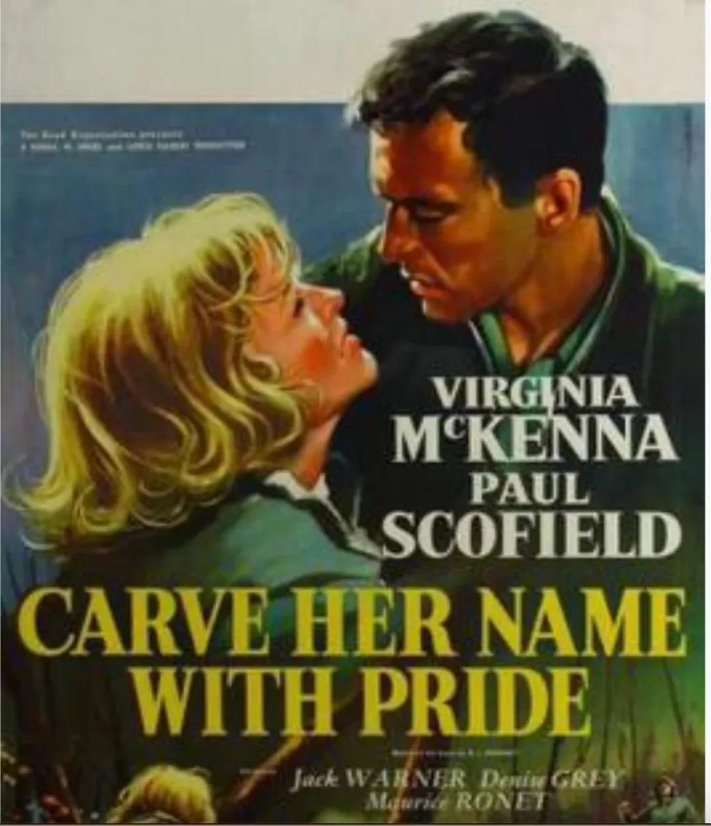 The wording is similar to the 1958 film -“Carve Her Name with Pride”, the story of Violette Szabo, an SOE agent in France, and stars Virginia McKenna and Paul Schofield. At the time it was released, the British public became aware of the role of SOE and the female agents. Although much of what they had done was still guarded, as the women had signed the Official Secrets Act.