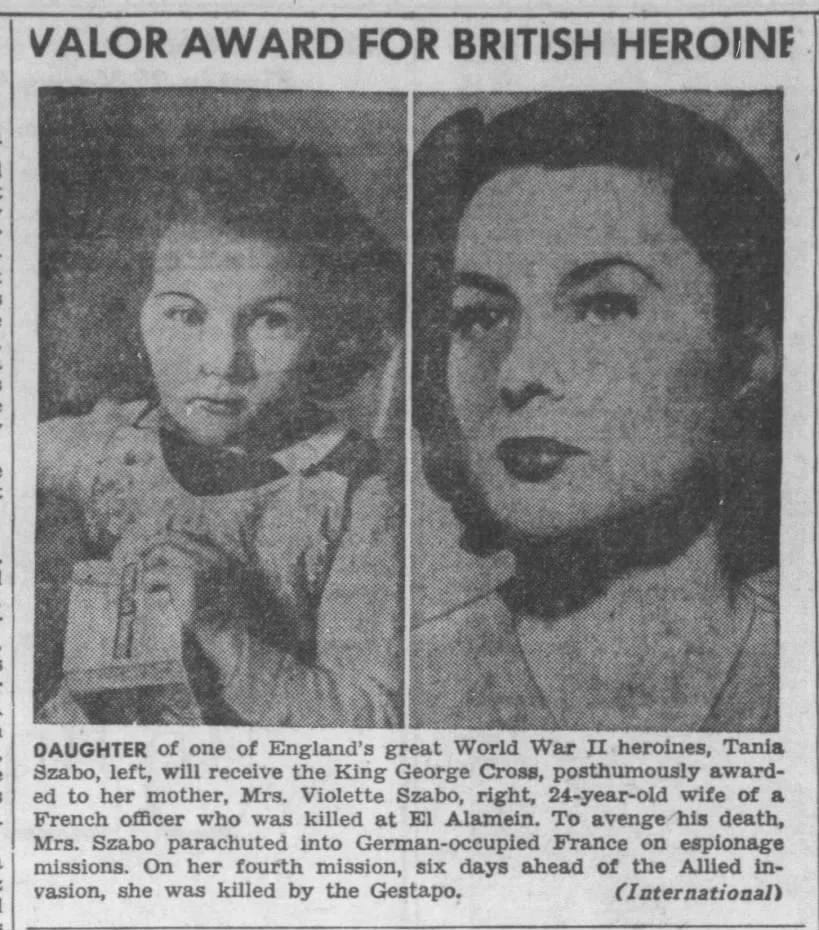 Violette Szabo was the second woman to be awarded the George Cross, posthumously awarded on December 17th, 1946, and Tania, then aged four, collected it. Violette was awarded the Croix de Guerre by the French government in 1947, along with La Medaille de la Resistance in 1973. She’s also listed on the Valençay SOE Memorial as one of the agents who died liberating France. Violette and Etienne are the most decorated married couple of World War II.